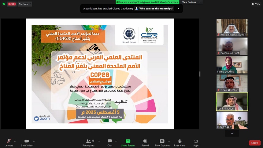 شاركت شبكة الشباب العربي للتنمية المستدامة في المنتدى العربي العلمي العربي لدعم مؤتمر الأمم المتحدة المعني بتغير المناخCOP28 والذي نظمته الشبكة الاقليمية للمسؤولية الاجتماعية بالتعاون مع الشبكة الوطنية للاتفاق العالمي للأمم المتحدة بالمملكة المغربية يوم الخميس الموافق 05/08/2023، عبر تطبيق الزووم، حيث حمل عنوان ” استراتيجيات لجعل مؤتمر الأمم المتحدة المعني بتغير الماخ نقطة تحول لدعم جهود المناخ في الدول العربية”