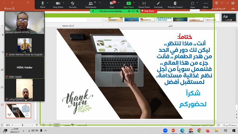 وقد شارك في هذه الجلسة التوعوية عددًا من الشباب العربي وناقشوا أسباب المشكلة والحلول العملية التي يمكن أن تحد منها، كما استعرض أ.الزيناتي تجارب أبرز البلدان العربية والأوربية التي تمكنت من خفض مستويات الأطعمة المهدورة والاستراتيجيات التي اتبعوها وأهميتها التي تتمثل أهمها في تقليل التلوث البيئي الناتج عن أطنان الأطعمة التي تتعرض للإتلاف.