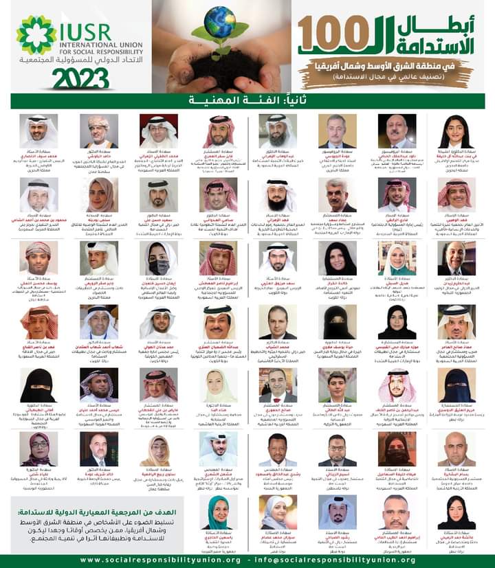 ووفق بيان للإتحاد الدولي للمسؤولية المجتمعية بمناسبة الإعلان عن “أبطال الاستدامة المئة في منطقة الشرق الأوسط وشمال أفريقيا قال: إن التصنيف المهني العالمي معنيٌ بتحديد شخصيات أحدثت أثرًا في عالم الاستدامة من دول الشرق الأوسط وشمال أفريقيا.