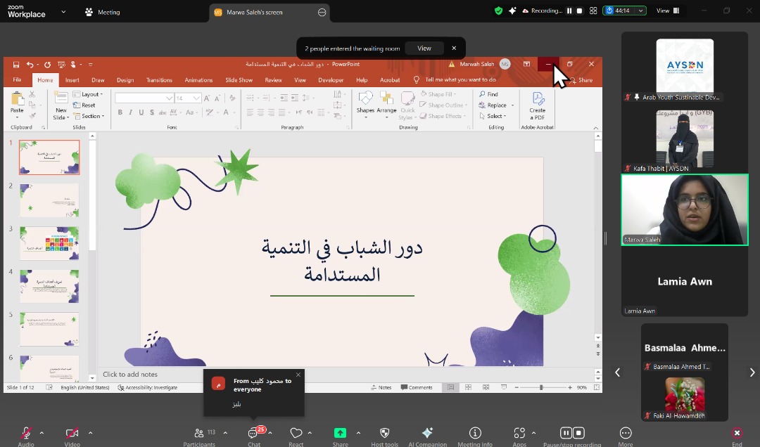 As part of the “Empowerment Program” and its continued efforts to raise awareness among Arab youth about their vital role in achieving the Sustainable Development Goals (SDGs), the Arab Youth Sustainable Development Network (AYSDN) held its fourth training session on Saturday, July 5, 2025, under the title: “The Role of Youth in Sustainable Development.”