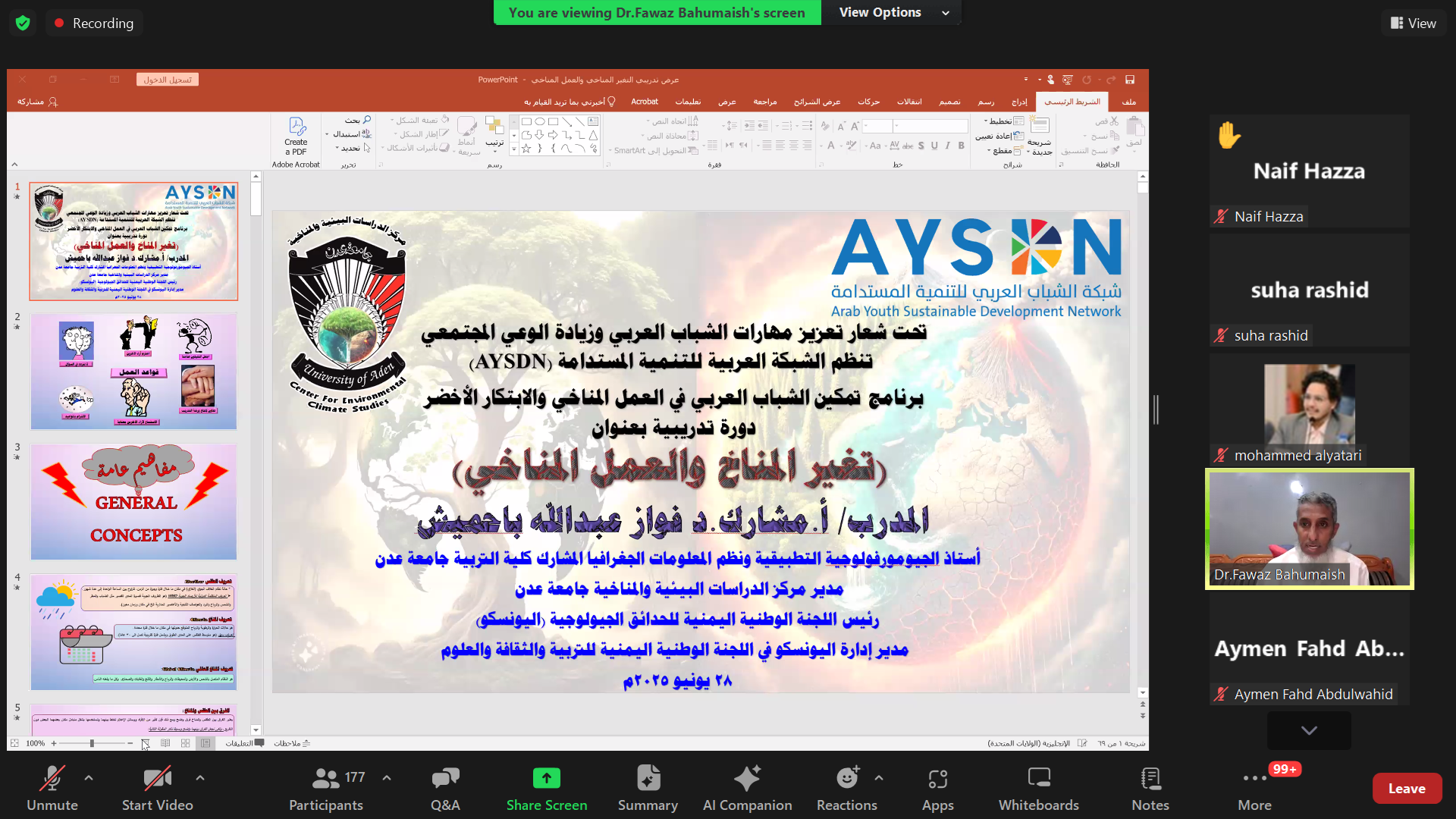 As part of its continued efforts to strengthen youth engagement in climate challenges, the Arab Youth Sustainable Development Network (AYSDN) launched the first session of its regional training program, “Empowering Youth in Climate Action and Green Innovation,” on Saturday, June 28, 2025, in a virtual event held via Zoom, with the participation of over 185 youth from across the Arab region.