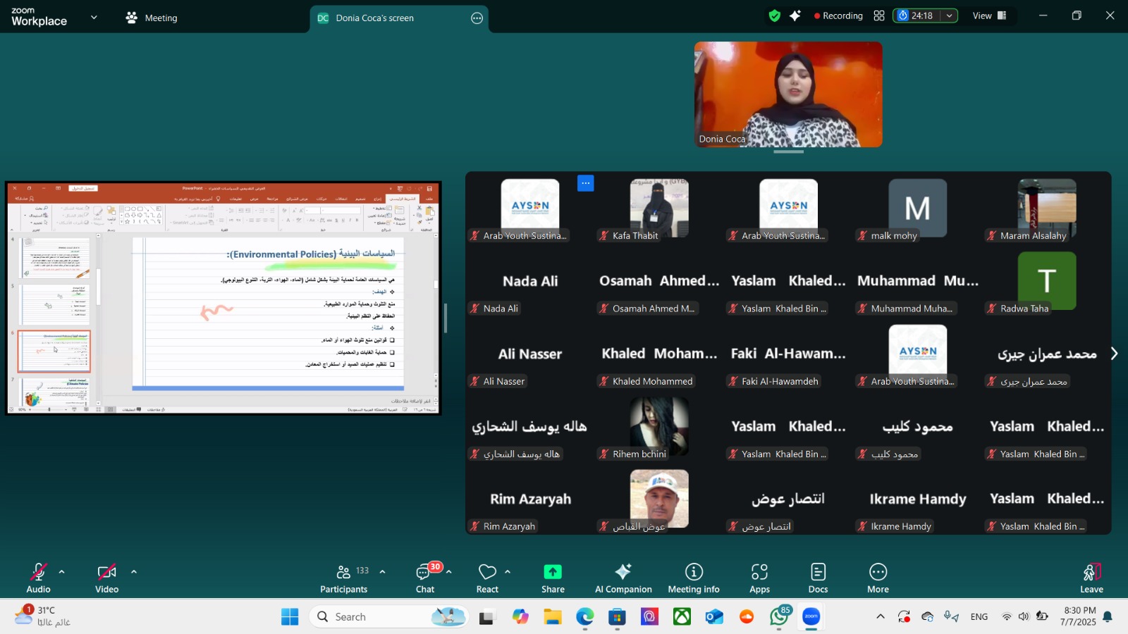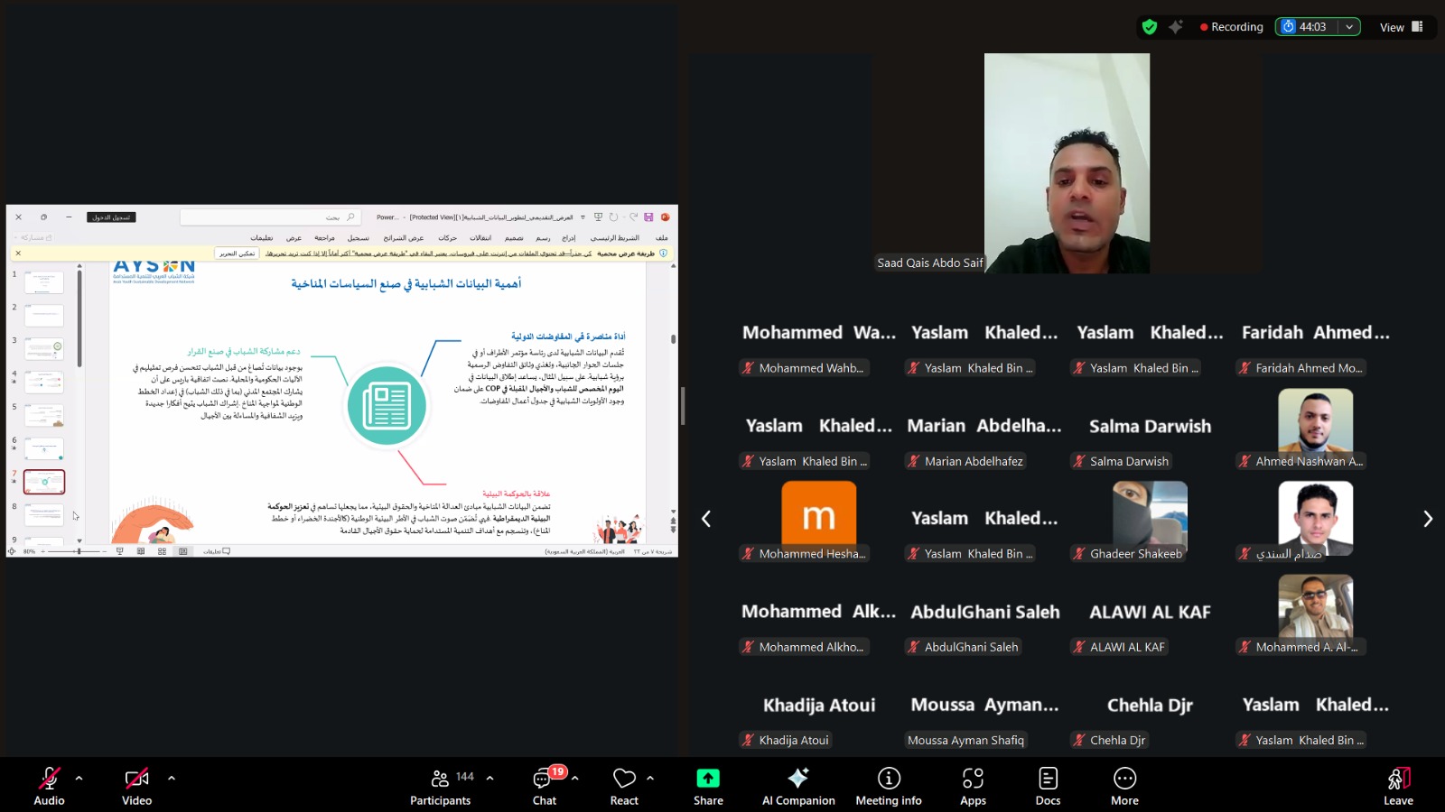 The Arab Youth Sustainable Development Network (AYSDN) organized the fifth session of its Empowerment program on Monday, July 7, 2025, under the title: “Developing Public Climate Change Policies – Youth Recommendations and Statements.” The session was held virtually via Zoom and gathered 146 youth participants from across the Arab world to engage in a focused dialogue on climate policy-making from a youth perspective.