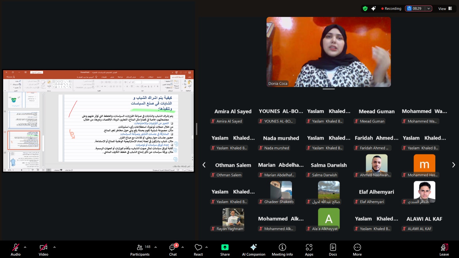 The session featured three inspiring speakers: Saad Al-Qais, a social and climate activist and researcher in youth, peacebuilding, and climate justice; Donia Hani Ali Kouka, a climate change researcher and trainer; and Bashar Nabil Abdulsamad, an environmental activist and trainer in climate governance. Each speaker brought forward practical insights and experiences reflecting the challenges and opportunities facing youth in influencing environmental policies in their respective countries.